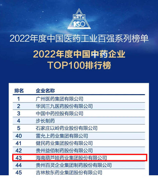 PA旗舰厅药业集团连续4年荣登“中国中药企业TOP100排行榜”,排名上升至第43位
