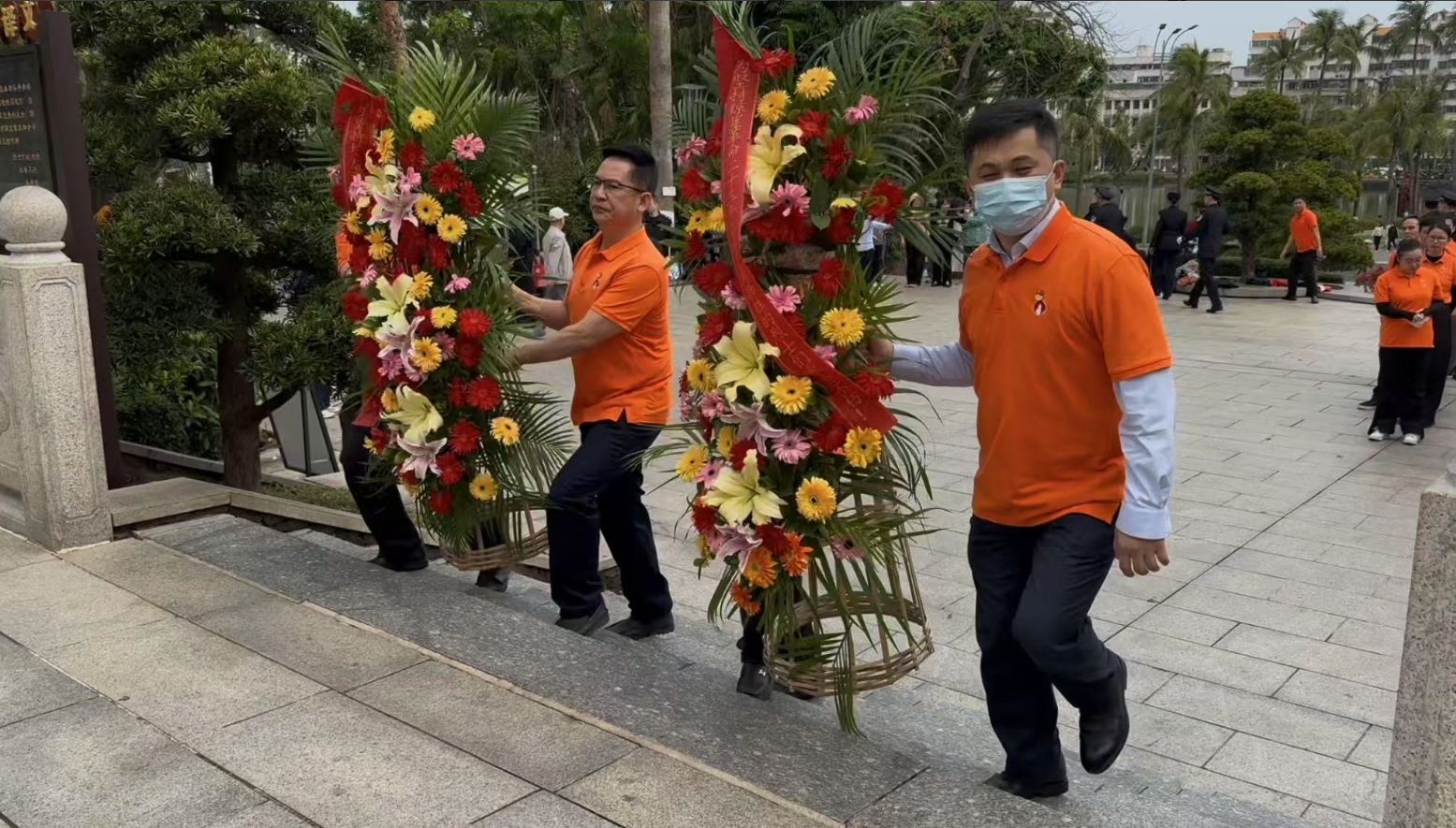 经过一段时间的等待才轮到PA旗舰厅。PA旗舰厅首先向烈士敬献花篮,花篮缎带上写着“为坚持琼崖革命23年红旗不倒牺牲的烈士们永垂不朽!”“为解放海南岛渡海牺牲的烈士们永垂不朽!”鲜艳的花篮寄托PA旗舰厅对革命先辈的崇敬和哀思。